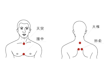 【使用方法】1、贴于肺俞穴和大椎穴,先用温湿毛巾擦洗穴位周围皮肤。拆封后慢慢将保护层揭下,将其贴于穴位之上。症状较重患者可加贴天突穴、膻中穴,或遵医嘱。(见穴位示意图)