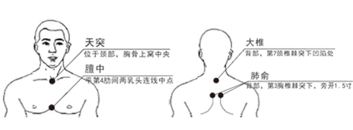 【用法用量】1、贴于肺俞穴和大椎穴,先用温毛巾擦洗穴位周围皮肤。拆封后慢慢将保护层揭下,将其贴于穴位之上,症状较重患者可加贴天突穴、膻中穴,或遵医嘱。(见穴位示意图)